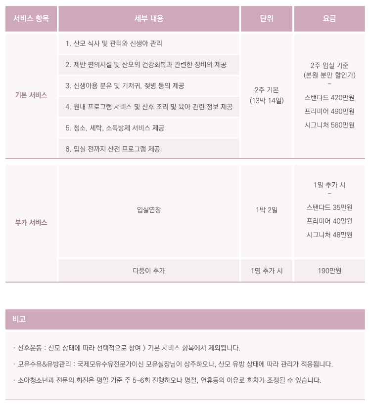 - 산후운동 : 산모 상태에 따라 선택적으로 참여 > 기본 서비스 항복에서 제외됩니다.